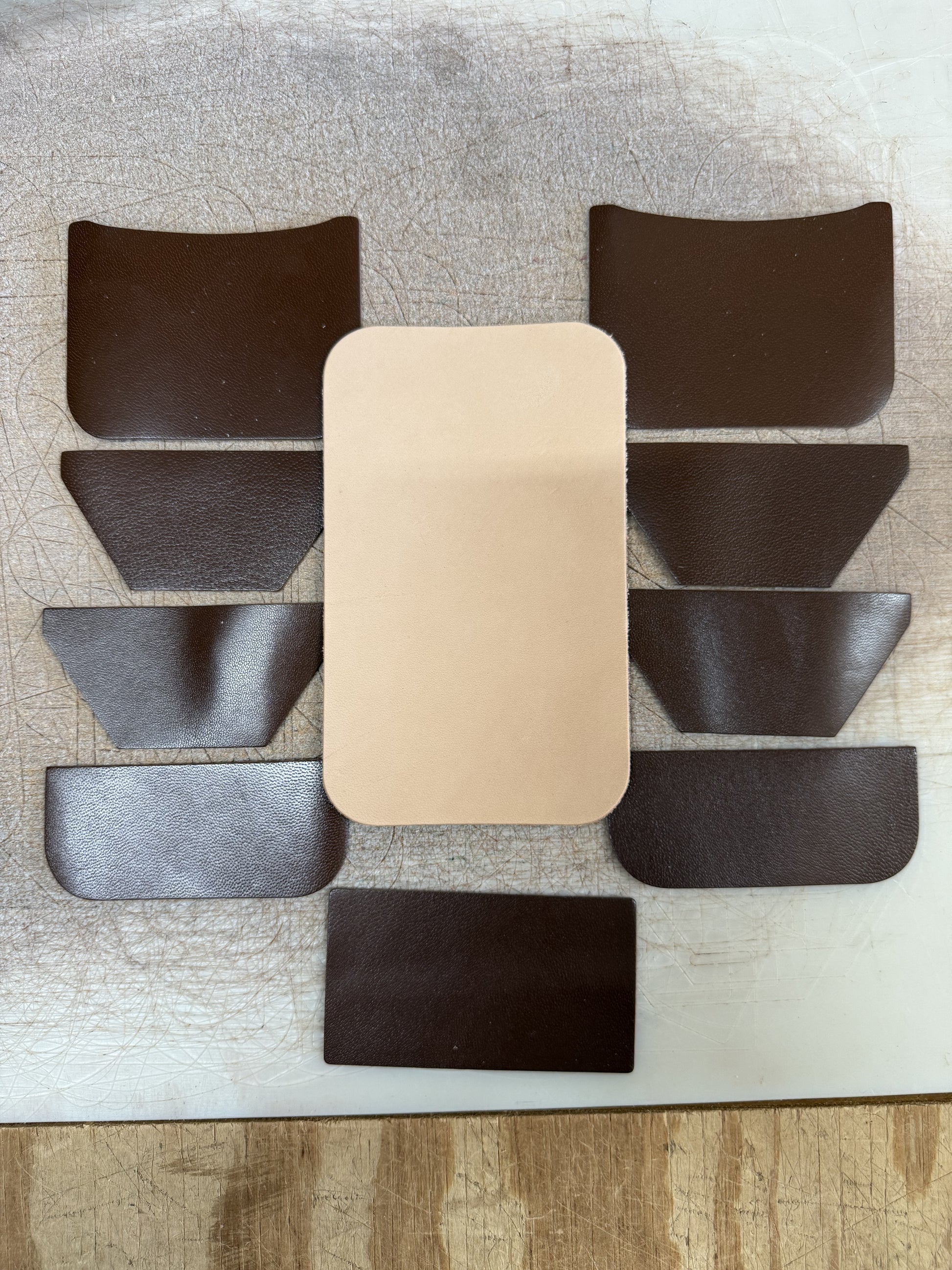 Material pack includes a Hermann Oak veg tanned body in a 4oz thickness as well as the interior pieces die cut from 2/3oz goat skin in an Antique Brown color.
