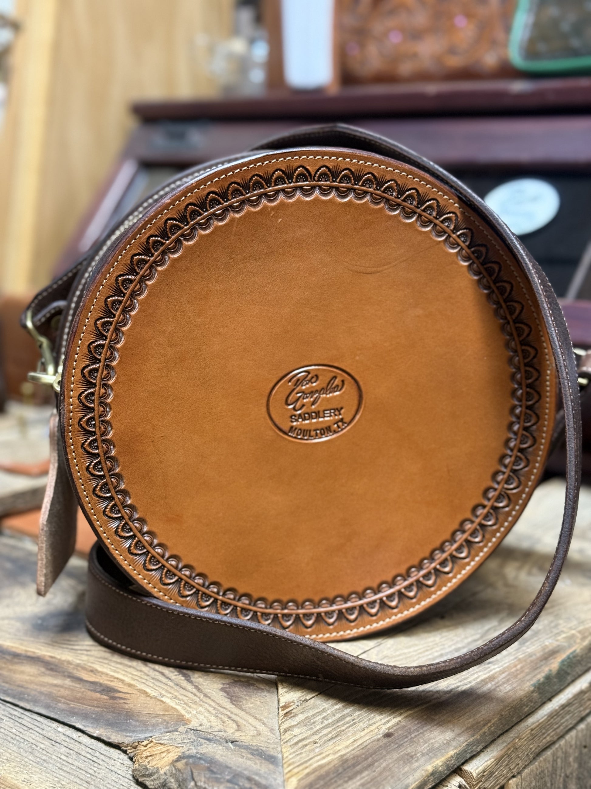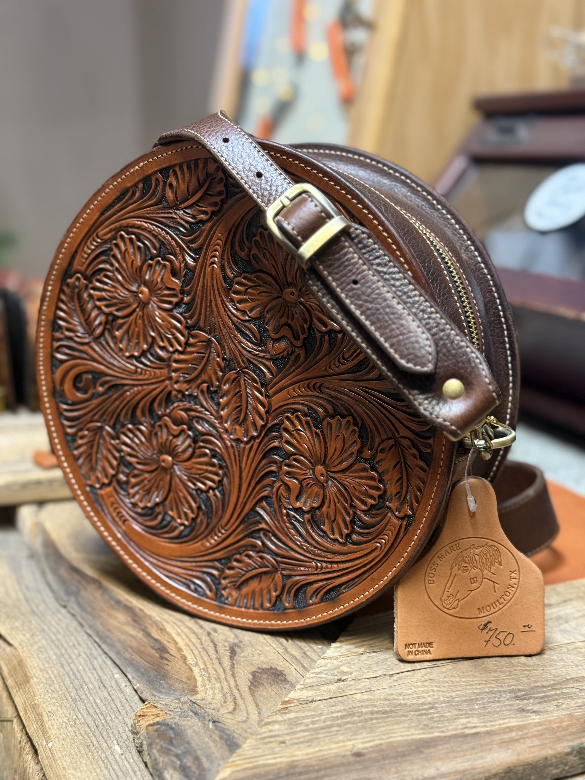 This 10” Round Cross Body Purse features full floral tooling on the front with a border pattern on the back.