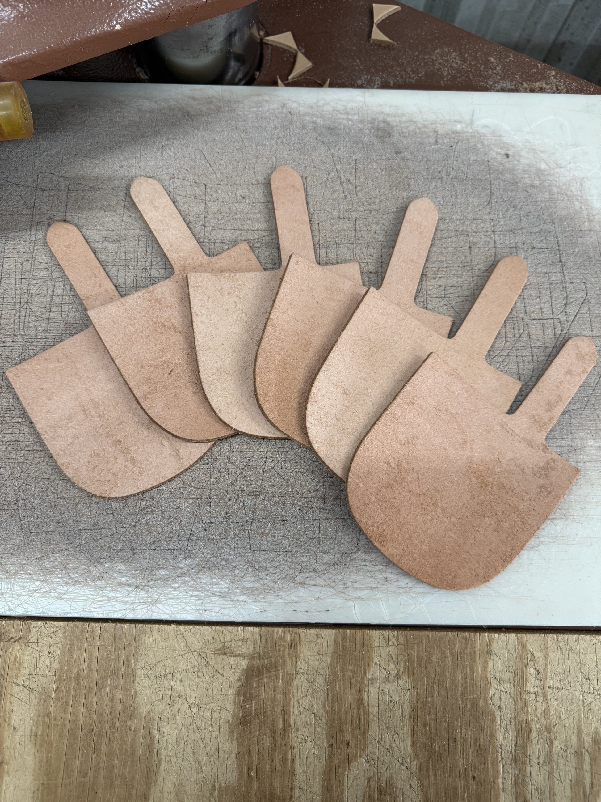 This is a 6 pack of rough out fold over knife sheaths cut from buffed Hermann Oak skirting leather. These are great for knife sheaths with a simple brand or initials with a cowboy look.